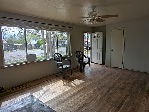 This charming home features stunning hardwood floors throughout, highlighted by a spacious living room adorned with a large picture window. The generously sized bedrooms offer ample comfort, complemented by a convenient built-in linen closet in the hallway. Ample vehicle parking, including a large RV parking area, ensures convenience for all residents. The expansive yard boasts three storage sheds, while a versatile workroom presents an ideal space for various activities, complete with a potential bar area and plumbing.