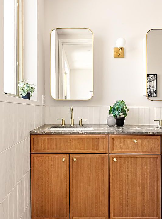 Oversized and practical kitchens are a true standout, featuring refined walnut cabinetry, brass hardware, and innovative storage solutions that you won't find anywhere else, including custom pull-out pantries and coat closets. Carrara marble counters and backsplashes add a luxurious touch, while brass plumbing fixtures elevate the space with a nod to the workmanship of the past. Prep and dining islands include wood pendants that echo the hand-carved millwork so prevalent throughout PLG. Stylish walnut bathroom vanities provide ample storage, while taupe-colored Japanese penny tile floors paired with honed marble countertops and soft white subway tile walls create a serene and spa-like feel in every bathroom. Primary baths often include double sinks, perfect for couples.