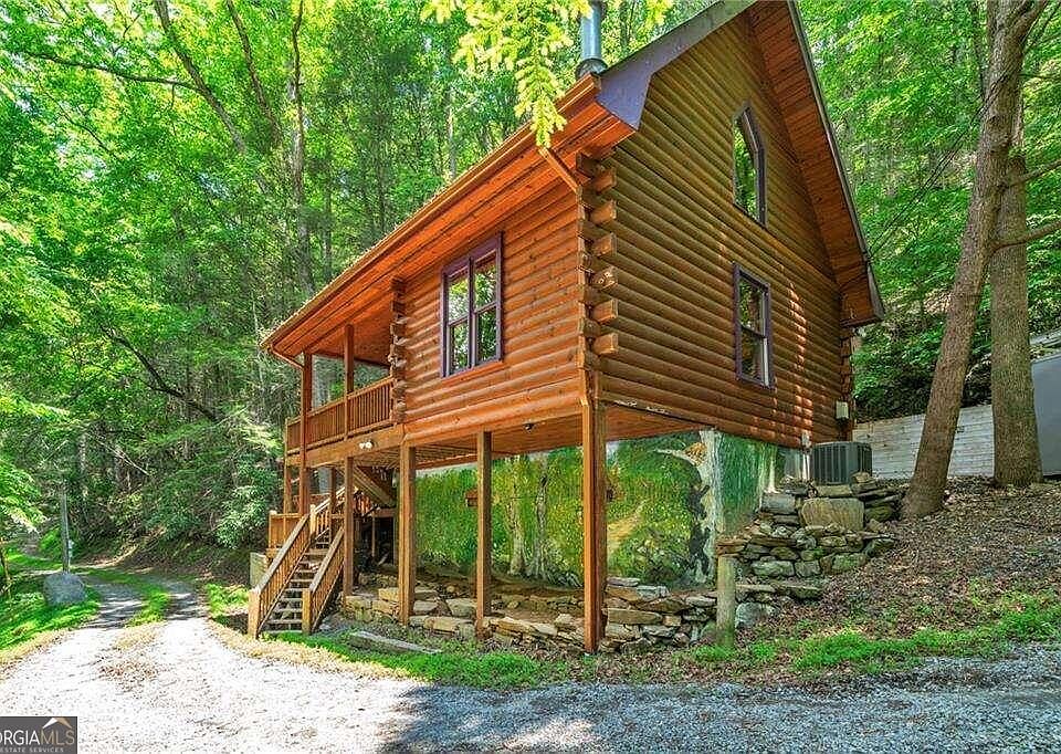 This Serene Mountain Getaway is the perfect place to relax! Soak in nature amongst the mature trees, babbling river, and mountain views. This riverfront log cabin features a uniquely painted mural, driveway parking and a staircase down to the water's edge. Quaint one level living includes master suite on main, open concept kitchen and living room + laundry on main. Spacious loft is great space to use as an additional bedroom option, home office, or bonus space. Enjoy the natural light that pours in all day through the windows. Stained wood walls/ceiling and floors give a warm homey feeling the minute you open the door. Snuggle up by the 2 story rock fireplace for a good book or cup of coffee. Or enjoy a dinner outside on the spacious deck. Endless potential in this property!