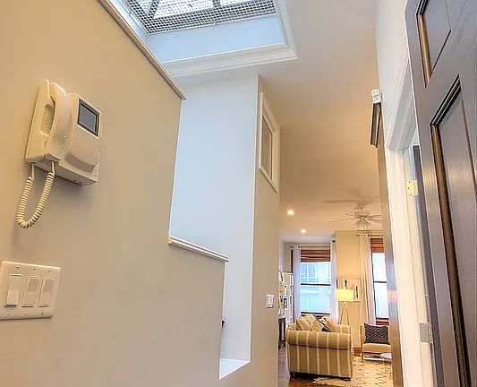The home spans an entire floor-through, offering exceptional privacy, tree-lined street views, and remarkable natural light enhanced by oversized windows, multiple skylights, and ceilings up to 10 feet. A generous open living and dining area anchors the main level, complete with a windowed nook perfect for a home office or reading lounge.