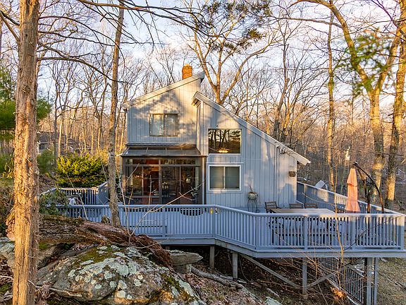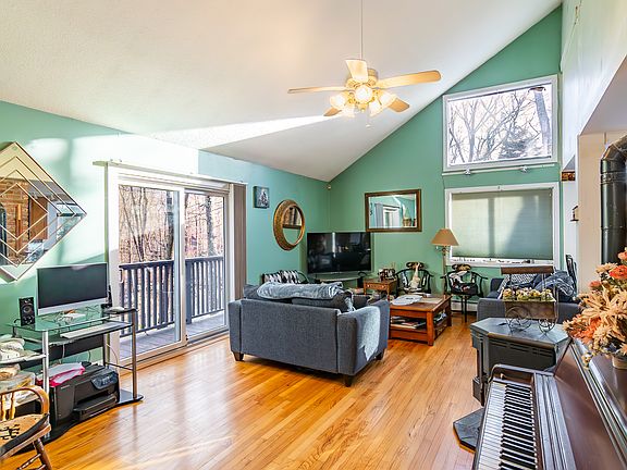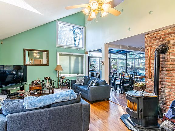Set on a peaceful and private 1.36-acre lot, this Contemporary Colonial home offers comfort, style, and a connection to nature. As you enter, you'll notice the home's open layout and soaring vaulted ceilings that create a bright and airy feel. The spacious living room includes beautiful hardwood floors, a pellet stove for cozy winter nights, and sliding doors that lead to a wraparound deck - perfect for relaxing or entertaining. The remodeled eat-in kitchen is both stylish and functional, with custom cabinetry, Corian countertops, and a sunroom just off the dining area. Step through the sliders to enjoy peaceful views of the backyard. The primary bedroom is located on the main floor with direct access to a beautifully updated bathroom. Upstairs, two additional bedrooms with cathedral ceilings and a second full bath provide plenty of space for family, guests, or a home office. Additional highlights include a full partially finished basement, main-level laundry, a one-car attached garage, and a wraparound porch overlooking the wooded lot. The home is equipped with a private well, septic system, and a mix of electric, oil, and wood pellet heating options. Newer roof and driveway. Enjoy the quiet, natural setting while still being within a short drive of Guilford's town center, shopping, schools, and local beaches.