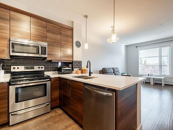 Welcome to life at The Ion in Ambleside, one of SW Edmonton’s most loved communities, where you can enjoy trails and parks right outside your door along with endless shopping + dining at the Currents of Windermere. This recently updated 2nd-floor condo feels bright and inviting with 9-foot ceilings, engineered hardwood floors & a seamless open layout. The updated kitchen shines with white quartz counters, while the bathroom carries the same elevated finishes + a modern tile surround. Your east-facing patio offers leafy views + a perfect sense of privacy. The bedroom is spacious with a walk-in closet, the laundry room has extra storage, and the built-in desk is ideal for work-from-home days. With heated underground parking, a storage unit, and building amenities including a gym, social room, picnic gazebo, and BBQ gas line, this home truly offers the full package. Perfect for a first home, a stylish downsize, or as an investment property - currently rented at $1550 per month. An incredible opportunity!