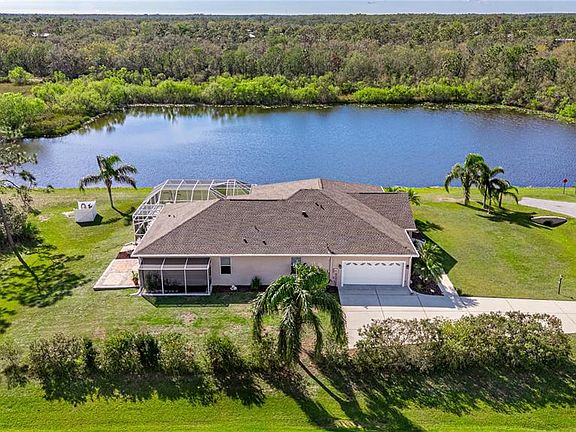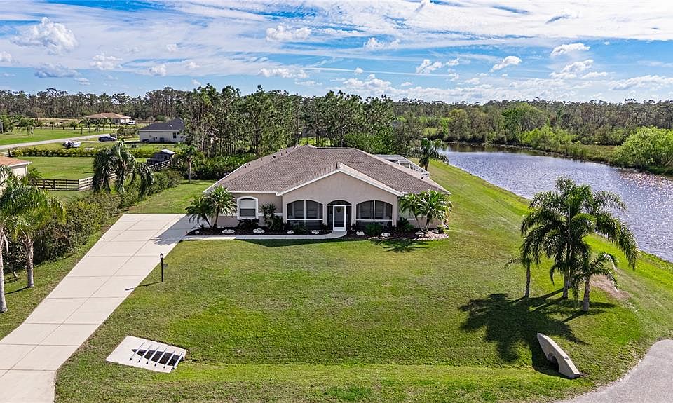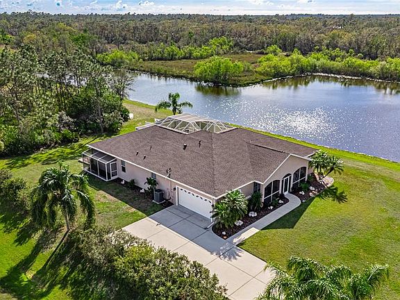 Discover the perfect blend of luxury, privacy, and natural beauty in this stunning 4-bedroom, 4-bathroom lakefront home, nestled at the end of a quiet dead-end street on just under an acre of serene, forested property. With breathtaking water views and a peaceful preserve behind, this home offers complete privacy, ensuring the ultimate tranquility. Thoughtfully positioned, the home sits safely elevated high above the retention pond, providing both stunning scenery and peace of mind. Designed with both comfort and functionality in mind, the spacious split floor plan allows for a master suite tucked away from the guest bedrooms for added seclusion. The master suite is a retreat in itself, featuring three closets (including a walk-in and linen), dual sinks, an onyx countertop, a jacuzzi tub, a walk-in shower, and stunning water views from every angle. Three of the four bedrooms include en-suite bathrooms, while the fourth bath is perfectly positioned for guests, with direct access to the lanai for seamless indoor-outdoor living. All bathrooms feature elegant marble countertops, adding a refined touch throughout the home. The heart of the home is the expansive kitchen, complete with stone countertops, ample storage, a pantry, and a new refrigerator (2022), all while offering beautiful water views. The kitchen opens into casual and formal living spaces, creating an ideal environment for entertaining, enhanced by an indoor/outdoor speaker system. Large windows and sliding glass doors flood the home with natural light, enhancing the open feel and offering easy access to the lanai. Outside, enjoy the ultimate in outdoor living with a heated saltwater pool, spa, outdoor shower, and a separate enclosed garden area. The fully screened lanai ensures a peaceful and secure space to relax, entertain, or enjoy al fresco dining, while the private outdoor areas are perfect for embracing the surrounding nature. This property is zoned agricultural (not residential), so chickens, goats, and other small livestock are welcome if desired. This home has been thoughtfully updated with major improvements, including a new roof (2023), new Trane HVAC system with upgraded soft start (2023), new hybrid water heater (2023), and a new well pump (2022). Additionally, all smoke alarms throughout the house and a carbon monoxide detector were installed in 2024, with batteries and units designed to last 10 years, ensuring safety and peace of mind. Located in the up-and-coming area of Myakka City, this home offers the perfect balance of seclusion and convenience. It's just a short drive to shopping, dining, and local parks, including Myakka River and Lake Manatee State Parks. This property comes with a transferable business permit, previously operating as an Airbnb retreat, offering the potential for passive income or future resale value. Whether you're seeking a peaceful retreat, an investment opportunity, or both, this home presents an exceptional chance to enjoy the best of both worlds—privacy and tranquility, with endless possibilities for use. Nestled in a prime location with easy access to Lakewood Ranch, Waterside Place, UTC Mall, Boutique Shopping, Airports, and Beautiful Parks - offering both convenience and lifestyle at your doorstep.