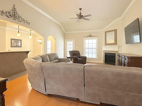Step inside to find elegant crown molding, granite countertops, espresso cabinets, and a tasteful tile backsplash in the kitchen. The open-concept layout seamlessly connects the kitchen, dining, and living areas—highlighted by wooden floors, a cozy fireplace, and custom blinds throughout.