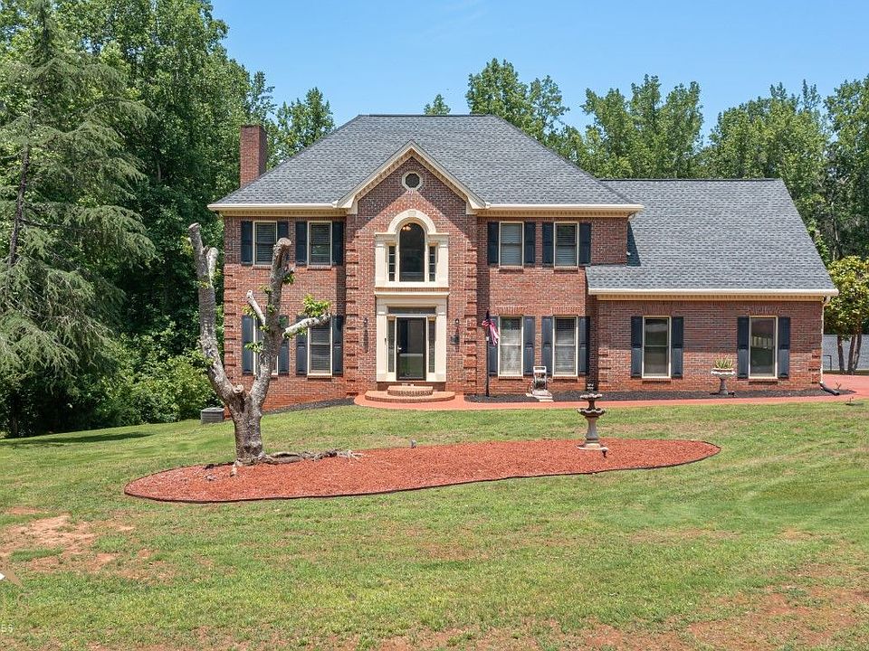 Beautiful all brick home with 4 bedrooms, 3.5 baths, full finished basement, detached garage and large 2.49 acre lot located in sought after community. The main level offers formal dining room and large office just off of the foyer, fireplace with wood burning insert in family room with access to enclosed sun room. Wet bar and half bath for entertaining, large kitchen with eating area, pantry, stainless appliances also with an entrance to gorgeous sunroom with newly installed decks on each side and a view of crystal clear pool and beautiful wooded lot. Upstairs offers an over sized primary suite with sitting area with built in's, large walk in closet and double doors leading to elegant en-suite with amazing view from spa tub to pool. Three more bedrooms upstairs and a newly renovated guest bath. All bedrooms with walk in closets and one room is extra large with stairs leading to large laundry/mud room on main level. Basement has a large family room with a brick fireplace w/gas logs, a bonus/bedroom, full kitchen w/laundry area, a huge storage/pantry/walk-in closet and a full bathroom and would be perfect for in-laws, adult child or rental potential with private exterior entrance. Home also has a two car garage attached and an additional detached garage with private drive and extra parking for RV. Detached is stubbed for bathroom and has a loft area. This could also be perfect rental potential if finished out or the perfect man cave or she shed!! So much to offer in this very well maintained home with new roof on main home and detached less than 2 yrs old.