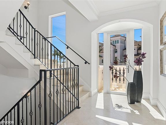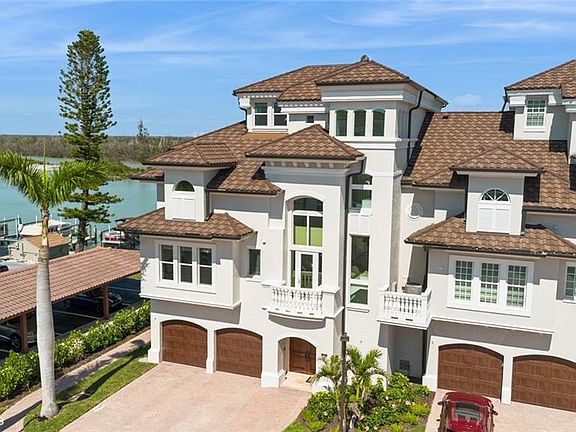 Elegant Coastal Retreat with Amazing Views & Direct Gulf Access. Wake up to breathtaking sunrises, unwind with stunning sunsets, and watch dolphins play in the bay—all from the comfort of your lanai. This stunning four-story home is situated in the small, gated community of Solenzara, one of Bonita Beach’s hidden gems, offering luxury coastal living just across the street from the pristine white-sand beaches, and a five-minute boat ride to the Gulf. From the moment you step inside, you are welcomed by a grand foyer with a private oversized elevator providing seamless access to all levels. The first floor features a spacious family room and generous storage space, perfect for coastal living essentials. Ascend to the second floor, where living and dining areas are bathed in natural light, showcasing panoramic views of the bay and Gulf. The living room with a gas fireplace adds warmth and elegance, while the kitchen is complete with a Wolf 48” gas range and double oven and Sub-Zero appliances. This level also includes an office, powder bath, laundry room and guest bedroom with a private ensuite bedroom. The third floor is home to the primary master suite, a true sanctuary featuring a walk-in closet, two private lanais, ensuite bathroom with dual vanities, a jacuzzi tub, separate shower, and a double-sided gas fireplace for ultimate relaxation. A second guest suite with a private balcony and ensuite bath completes this level. The fourth floor boasts a second master suite, offering complete privacy with an ensuite bath, walk-in closet and a private deck overlooking the Gulf—the perfect spot to enjoy morning coffee with a view. Designed for effortless indoor-outdoor living, this home features an outdoor kitchen, an elevated private pool and a hot tub, renovated in 2024. Upgrades also include a picture window screen enclosure, new pool equipment, new railings, new windows, new roof, exterior paint, and updated electrical systems. With insurance and flood coverage included in your quarterly HOA fees, and brand new generator, this home is ready for you to move in and start living the ultimate waterfront lifestyle. For added convenience, furniture is negotiable, and a private boat dock with a lift is available for purchase at an additional cost—making this the ultimate waterfront lifestyle home Don’t miss this rare opportunity to own a luxury retreat in Bonita Springs!