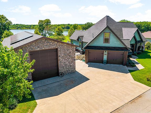 Beautiful CUSTOM Home on Grand Lake! Grove Schools! This exquisite property checks all the boxes!! NO HOA! VRBO IS allowed! 30x60 RV shop w/bathroom, 10x30 lean-to w/chicken coop, Dockable lakefront!(16x32 Pool w/solar panel pool heater, solar panels on shop accommodates home,(30 panels/$45,000) fenced and whole home backup generator & water filtration system. The 2300 + Sq. Ft. (m/l) Home boasts an open concept floorplan with Split bedrooms, plus office/4th bedroom & upstairs bonus room/5th bedroom. Owners suite overlooks lakefront & pool w/private entrance. Owners glamour bath has separate shower, custom tub & saferoom/storm shelter. Gas see through fireplace separates formal dining & living. both w/hardwood flooring. Chefs spacious Kitchen w/plenty of storage & lrg pantry. Eat-in breakfast area & breakfast bar. Laundry room leads to insulated garage w/heat & air. Epoxy floors in all wet areas. Covered deck overlooks pool, has outdoor natural gas connection for grill or smoker & is private. Cat condo/screened in porch for the fur baby has cat door to come and go from house. Close to shopping, medical, casino, shangri-la by land or lake and close to other resort amenities. Fiber optic BOLT internet. Paved roads all the way. close to Hwy 59 and I44. Landscaped & trees. Gravel area for outdoor additional storage. Move in ready!!