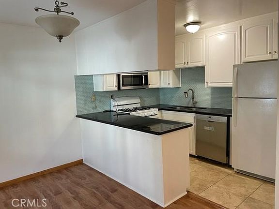 Super clean and modern condo for lease in the gated Lomita Horizon Complex. Spacious living room overlooking the fenced pool area. Laminate wood flooring throughout most of the space. Remodeled kitchen with white cabinets and black granite counters ... appliances included. 2 bedrooms and 1 bathroom. Ceiling fans and mirrored closet doors in both bedrooms. The bathroom was tastefully remodeled featuring a large tiled shower. Convenient first floor level. The complex has gated garage spaces. 2 parking spaces and a storage closet come with this unit. Dual paned windows. Community pool, spa and laundry. Cable, water and trash are included. One small pet ok. Available now.