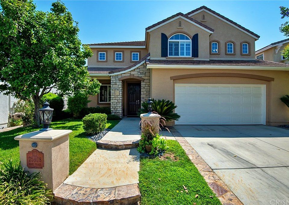 Welcome to the this gorgeous updated Stevenson Ranch view home! Boasting 5 bedrooms, 3 baths, loft, office, and nearly 3,200 sqft of open living space. Walk through the double doors to a beautifully appointed formal living room, surrounded by windows that flood the room with natural light. You will love the elegant wood flooring, plantation shutters, and designer touches throughout. Continue into the formal dining area, accented by an eye-catching chandelier. The chef's kitchen features an oversized island w/granite counters, stainless appliances, a double oven w/french doors, an abundance of cabinetry and modern farmhouse inspired light fixtures. You will love the additional eat-in dining area providing space to entertain. The family room is ample in size and has a lovely fireplace. Additionally, find a downstairs bedroom, full bath, mud room and 2 car attached garage. Upstairs, find the enormous loft area, office nook/gym space, and an additional built in desk. The master suite is sure to impress with its stunning views, huge balcony, and custom barn door. The large ensuite bath has dual vanities, a separate tub and shower, and a large walk in closet. Find 3 add'l bedrooms, newly built laundry room and an upgraded bath with custom tile work. Enjoy a large pool and spa, built in fire pit, outdoor kitchen, covered patio, artificial turf, and expansive views of the neighborhood and surrounding mountains. Close to award-winning schools, shopping, and convenient access to LA.
