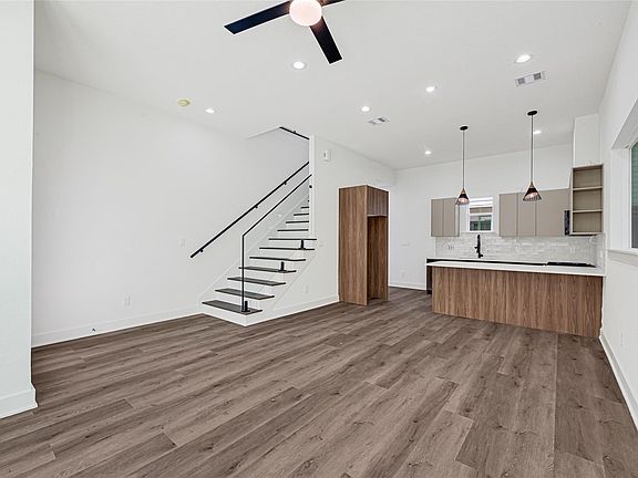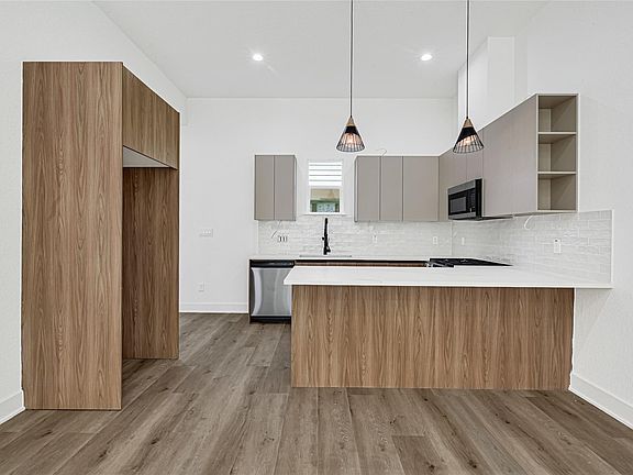 Inside, every detail is thoughtfully designed. Luxury vinyl flooring flows throughout, creating a warm, durable, and elevated foundation. The kitchens and baths feature sleek European-style cabinetry paired with designer tile that extends to the ceiling, giving each space a modern, boutique-inspired look.
