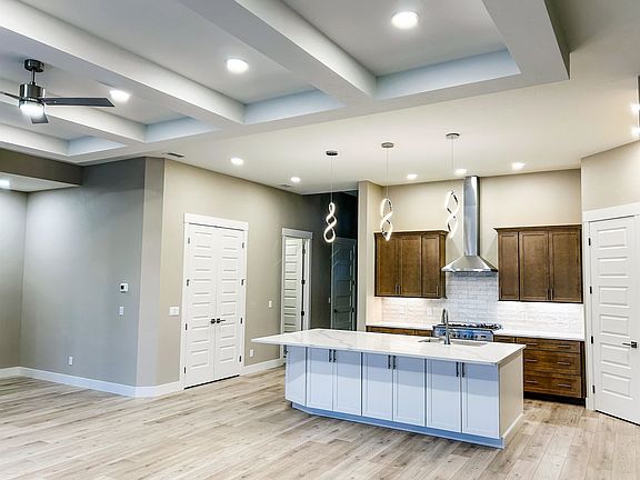 PRICE REDUCTION**Grand Entry: 12 ft ceilings leading to an open kitchen and dining area with 11 ft detailed ceilings and 8 ft doors. *Office: Glass French doors and an impressive 16 ft ceiling with intricate details. *Primary Suite: Spacious 10 ft detailed ceilings in the bedroom and bath. *Bedrooms: Generous 9 ft ceilings throughout. *Flooring: Luxury, water- and scratch-resistant laminate. *Kitchen: Nearly 10 ft long island for entertaining and functionality. *Outdoor Living: 300 sq. ft. covered back patio and 121 sq. ft. covered front porch. *Living Room: Stunning 11 ft tall fireplace wall. *Garage: Expansive 40 ft long wall on half of the garage snd 30 ft on the other half for ample storage and parking. *Location: Luxury living in a high-end subdivision just 5-10 minutes from town and the hospital. *This home’s amenities are a must-see—schedule a tour today!