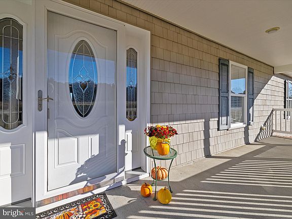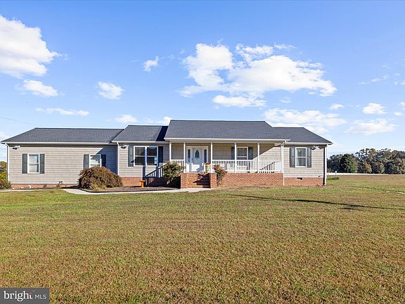 Set amid wide-open countryside in Denton, MD (Caroline County 21629), this single-level home is in immaculate, move-in ready condition. A covered front porch opens to a bright entry with hardwood floors and a flexible dining area that connects to the kitchen. Cook and gather with warm wood cabinetry, peninsula bar seating, under-cabinet lighting, and a sink window framing rural views. The living room offers soft neutral tones and recessed lighting for relaxed evenings. Three bedrooms include a light-filled primary suite with dual-vanity bath and soaking tub; a hall bath and a convenient half bath serve guests. Step outside to an expansive composite deck overlooking open fields—ideal for al-fresco dining, morning coffee, or stargazing under Eastern Shore skies. An oversized two-car garage with high ceilings adds storage and workshop flexibility. Designed for low-maintenance living, quality details include 2×6 exterior walls, insulated garage, concrete-slab ( 5') crawl space, Cedar Impressions shingle siding, GAF roof (2020), and central vacuum. Finished area 2,105 sq ft per iGUIDE/ANSI (buyer to verify); floor plan available. Pre-wired for cable/fiber internet supports work-from-home. Enjoy quiet rural living minutes to Denton conveniences, parks, and commuter routes—carefully maintained, maintenance-friendly materials, and truly move-in ready.