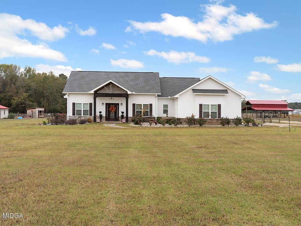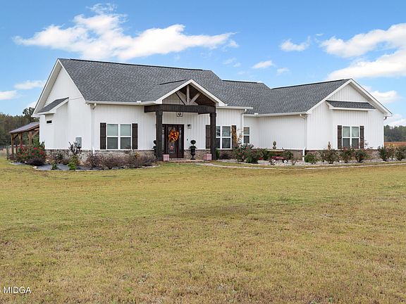 Additional highlights include a two-car garage with insulated garage doors, a mud area, three outbuildings, a covered pavilion, and a relaxing covered back porch overlooking the beautiful level yard. Perfect for horses! Located in a quiet rural area with no HOA or city taxes, yet within an easy drive to Warner Robins Air Force Base and Perry amenities.
