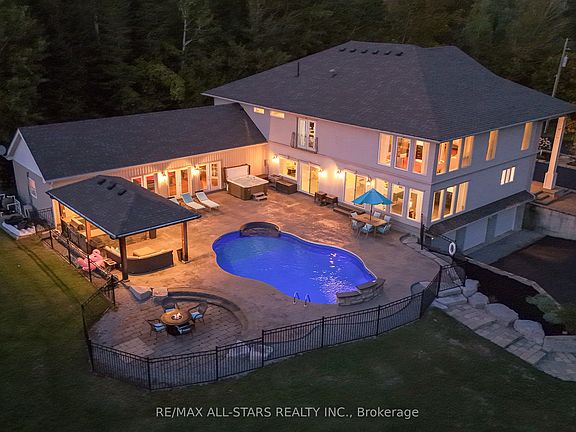 10-Acre Property. Resort-like pool and entertainment area. $$$. Spent On Renovations Inside And Out. Over 5000 Sq.Ft., 20 Ft Ceiling Hallway With Tervanian Stone Floors, Dramatic Stairs, Coffered Ceilings, And Moldings. A Stunning Kitchen With B/I Appliances, Large Stove, And Fridge. Wait Until You See The heated floor Great Room, with B/I Bar and W/O to Deck and Cathedral Ceiling: 5 bedrooms, 5 washrooms, rounded corner drywall, office or in-law suite on the main floor. Heated salt water pool, Water softener with UV light, renovated Bunkie for the kids in the backyard, and your private winter fun skating pond. The outdoor Barbecue and fire pit are gas-connected.