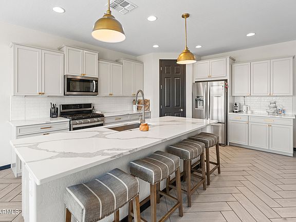 Beautifully upgraded Stella floor plan in Festival Foothills—perfect for family living, entertaining & enjoying Arizona's outdoor lifestyle! This 2,172 sq ft home features 3 split bedrooms, 2 baths, and a flexible office/den ideal for working from home or quiet retreat. The expansive kitchen offers sleek quartz countertops, pullout cabinetry, a walk-in pantry & an adjoining café-style dining space—ideal for morning coffee or casual meals. The open great room impresses with a custom audio/visual wall & cozy built-in fireplace, making it perfect for movie nights or gatherings. Step outside to a large, south-facing backyard with low-maintenance synthetic grass, stunning mountain views & a full-length covered patio—ideal for entertaining or relaxing in the shade. Located just minutes from the K-8 school, scenic parks, walking trails, Indigo Grill & Copper Canyon Golf Course. A perfect blend of comfort, style & location!