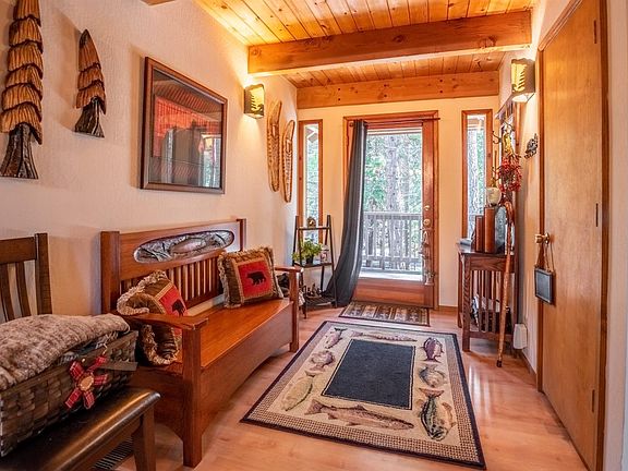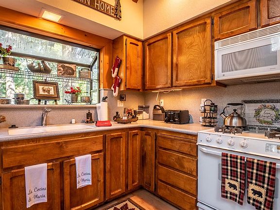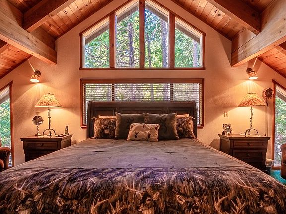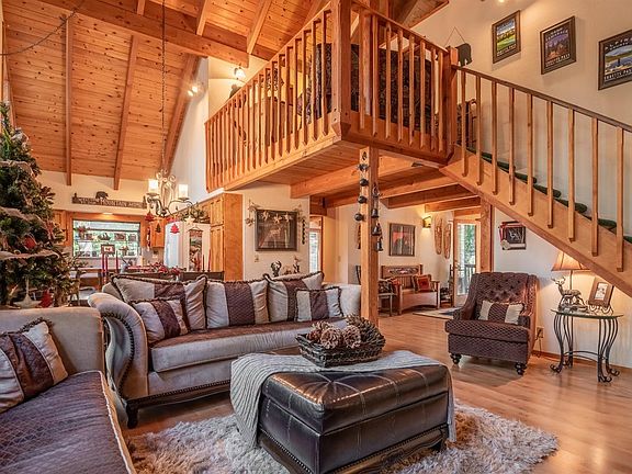 This custom built, mostly furnished 3 bedroom, 2 bath chalet cabin boasts expansive walls of windows throughout. Vaulted pine ceilings give a true cabin feel while the open floor plan allows comfortable family gatherings. Upon entry you'll find two bedrooms and a full bathroom along with a spacious kitchen, dining area and living room. Upstairs you'll enjoy a comfy sitting space in the loft which leads to a private primary bedroom along with another full bathroom. This cabin offers central heat and an efficient wood burning stove for your wintertime comfort. Enjoy a cup of coffee in the morning on the back deck or relax in the hot tub at night. As if this weren't enough, the two car garage has been converted into a bonus room with pool table and bedroom/living space as well as a half bath upstairs. In addition to the large .77 acre lot, the adjacent .61 acre lot is available for purchase as well. This cabin is located in Big Trees Village, which offers optional access to the rec. center, 2 pools, tennis and bocce courts, etc. Square footage includes 1528 sq. ft. home plus approx. 500 sq. ft. bonus rooms in detached garage.