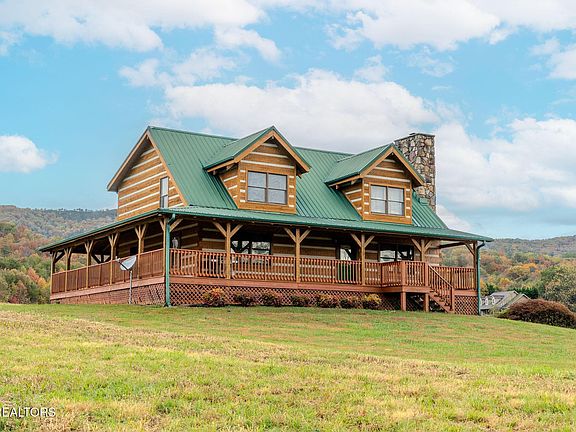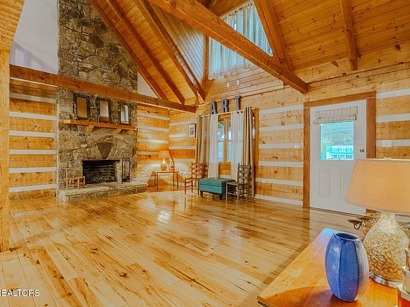 Beautiful True Log Cabin with Spacious Living and Rustic Charm! This stunning log cabin features soaring ceilings, gorgeous exposed wood beams, and beautiful hardwood floors throughout. Enjoy large bedrooms, two oversized bonus rooms, and a clean, unfinished basement offering endless possibilities for additional living or storage space. The open-concept kitchen includes stainless steel appliances that will convey, ample cabinetry, and direct access to the expansive back deck-perfect for entertaining or relaxing. The home also features a large stone wood-burning fireplace, a two-car garage, a concrete driveway, and generous closet space. Step outside to enjoy the peaceful country setting from the wraparound deck that covers three sides of the cabin and overlooks a beautiful, flat front yard. With no HOA, low county-only taxes, and easy access to all that Knoxville has to offer, this property provides the perfect balance of convenience and tranquility