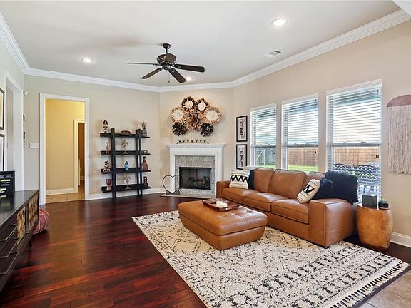 Almost like BRAND NEW, LARGE CORNER LOT ENTERGY SMART HOME!!! 8 years young with an open floor plan to kitchen and breakfast nook. Includes 9 ft ceilings, cornered gas fireplace, low E-3 insulated windows, and separate indoor laundry room. Wood flooring in living room and tile throughout hall, bath, kitchen, and breakfast nook. Separate primary bedroom ensuite with garden tub, separate shower, and his and her vanities. Beautiful, fenced in oversized backyard and patio with fire pit; easy backyard access and includes a backyard drainage system.
