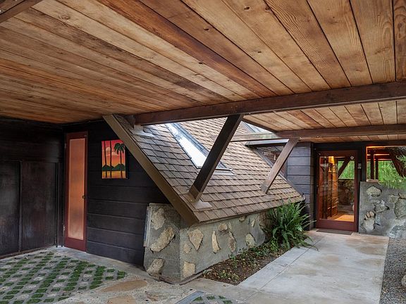 An architectural gem just up the street from downtown Carmel-by-the-Sea, Banyan House is the first home designed by Mark Mills in Carmel. After Mills was an apprentice at Frank Lloyd Wright's Taliesin Fellowship from 1944-48, Banyan House was financed by Mrs. Clinton (Della) Walker, the owner of Frank Lloyd Wright's only seashore designed house ever built, and sold to Mark Mills' father. From 1954 to 1957 Mark lived in the house, which is a significant example of Wrightian principles or organic architecture combining the use of "desert masonry" with local building materials. Other highlights include a custom iron gated entry, living room with fireplace, geometric windows flooding the spaces with natural light, and meticulously manicured grounds with pathways to explore. Mills' imaginative design skill at successfully integrating such an abstract plan comfortably into its landscape setting is very much in keeping with the Carmel tradition. With gorgeous woodwork and interesting details around every corner, this architectural innovation is a work of art and ready for its next loving owners to enjoy for years to come.