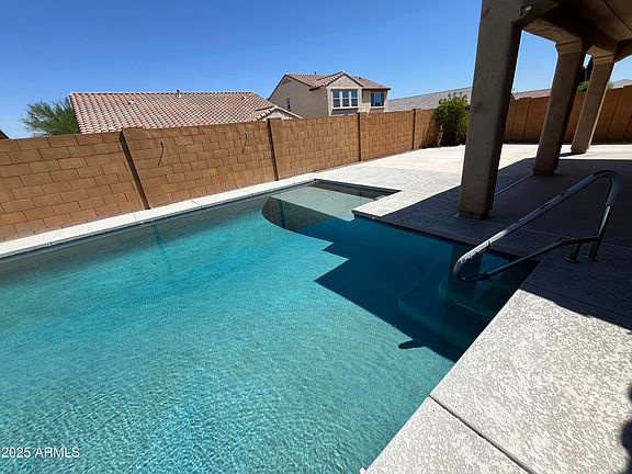 This home with pool is located in the community of Festival Foothills. Located on a north/south lot with RV gate. Home has new carpet in bedrooms, with new interior paint throughout home. The kitchen features a island breakfast bar, wood cabinets, glass tile backsplash, LED accent lighting and pantry. The primary bedroom is split, has a walk-in closet, dual sinks and separate toilet room. The Pebble Tech pool features a Baja step, sprinkler water features, umbrella holder with pool decking surrounding the pool and extended concrete patio in backyard. Two car garage with new coat of paint.