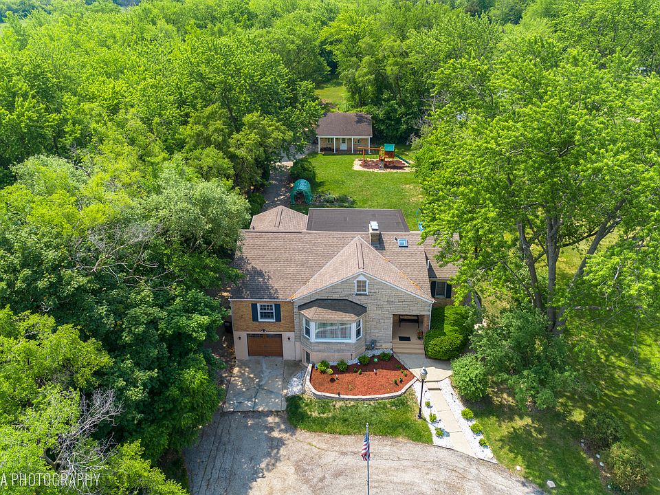 Beautiful two-story, Cape Code style home in STEVENSON and FREMONT school districts. The 1.5 acres of unincorporated land is like having your own nature preserve, a great place for kids and pets to enjoy. 1-car attached garage and an additional 3-car detached garage. Detached garage has power and electricity. Circle driveway with long extension to connect the detached garage. Space for ten cars in driveway. Property has a chain-link fence backstop for baseball and a new playground. Updated kitchen with cherry cabinets, granite countertops, recessed lights, ceramic backsplash, stainless steel appliances, and a built-in sideboard. Two bedrooms on the main floor with shared bathroom. Bathrooms have double sinks and a tiled shower. Sunroom on main floor with vaulted ceiling, skylight, and two doors leading outside. Cozy living room has a woodburning fireplace. Second floor has two additional bedrooms, a beautifully remodeled bathroom, and a cubby loft as a reading nook. Second floor bathroom has a tiled shower/tub. Ample storage, including a floored attic that's accessible from the Second floor. Finished basement walks out to lower-level patio. Additional woodburning fireplace in basement. Brick and stone exterior. Roof 2019. Pella Windows 2010. Private Well Water 2017. AC 2019. Furnace 2015. Plumbing/Electrical 2015.