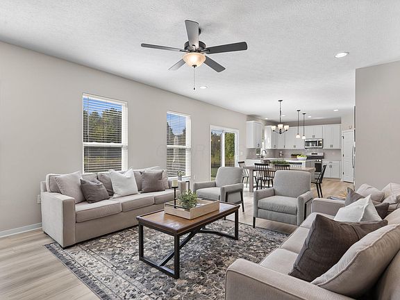 MOVE-IN READY! Discover this stunning home in the highly sought-after Farms at Jefferson, perfectly situated on a serene wooded lot. Architectural excellence shines throughout, featuring a fabulous chef's kitchen with quartz countertops that opens seamlessly to the dining area and spacious great room with a wall of windows. The main floor showcases beautiful views of the newly expanded patio, fenced yard, and wooded backdrop. Perfect for family gatherings and entertaining. The expansive owner's suite offers a vaulted ceiling, large walk-in closet, and a luxurious spa-inspired bath. Additional highlights include three family bedrooms, a full hall bath, second-floor laundry, a main-floor office or den, an inviting front porch, and an oversized two-car garage. The full basement with bathroom rough-in provides endless possibilities for future customization. Enjoy community amenities including a pool, playground, and scenic leisure paths all in one of the area's most desirable neighborhoods offering easy access to John Glenn International Airport, Easton Town Center, top-rated restaurants, and performing arts venues.