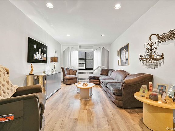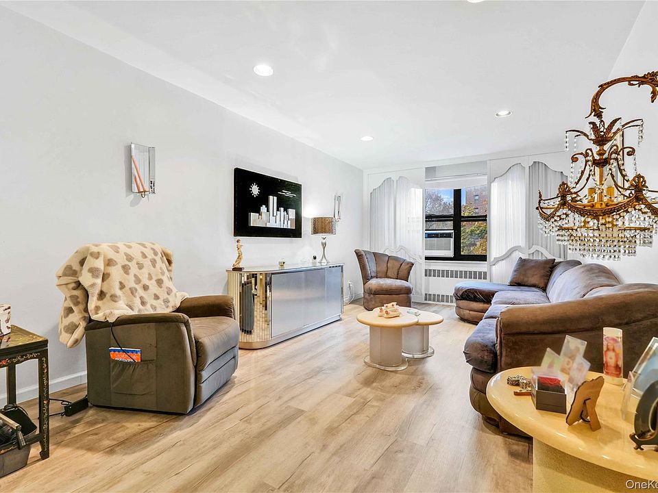 Bright and spacious 2-bedroom corner co-op in prime North Flushing. Located on the 5th floor with east and south exposures, this unit features an entry foyer with coat closet, formal dining area, large sun-filled living room, primary bedroom with double closets, second bedroom with dual windows, updated kitchen, and a newly renovated windowed bathroom. Luxury waterproof plank vinyl flooring throughout. Well-maintained elevator building with laundry room, playground, and one parking space available. Maintenance includes all utilities. Close to schools, post office, major transportation, and shopping.