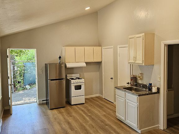 STUDIO Vaulted ceiling studio with approximately 300 sf. of space. Bathroom with stand up shower. Stove, Fridge and Kitchen Sink in one corner. Direct access to outdoors without going through common area. Main Room - 12' x 16' Bathroom - 5' 6" x 8' 10" Pantry - 2' x 3' 6"