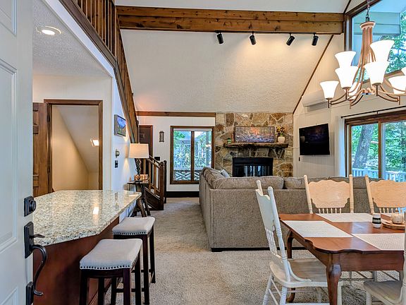 The lower level offers another expansive living area with a fireplace, a dining area with a wet bar, a full bathroom, storage space, and access to a one-car garage. Enjoy wrap-around decks on both levels and a private balcony off the loft.