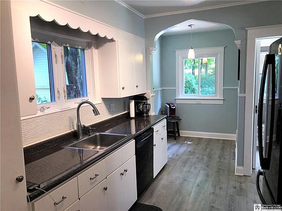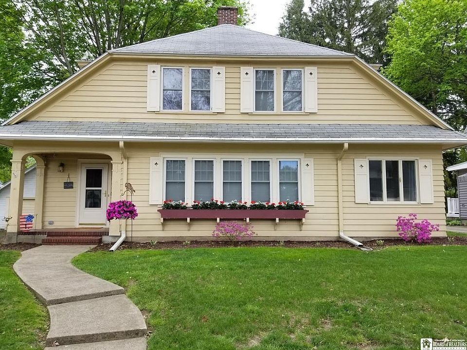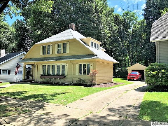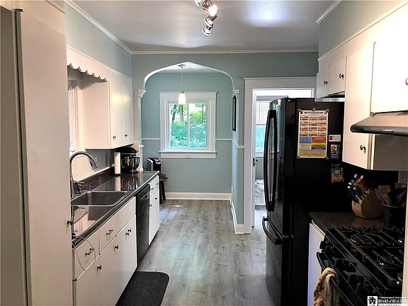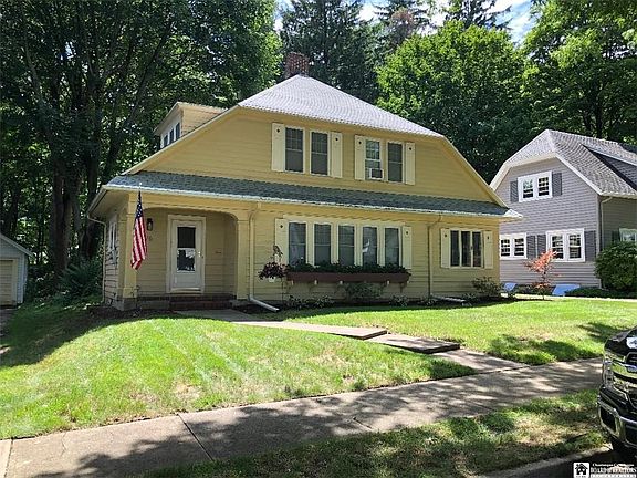 Located on a brick street with center boulevard, is this charming 3 bedroom, 1.5 bath home. Situated in one of Jamestown's quiet Northside neighborhoods this home features a spacious living room with gas burning fireplace, formal dining room with 2 built in hutches, a bonus room that could be a den/study and modern kitchen with half bath off of it and a charming nook that overlooks the private yard. Upstairs are the 3 bedrooms and remodeled full bath. Inside this home also features: new windows, new flooring and hardwood floors were refinished,hot water tank is a year old, all new appliances,newly repainted and new back door. Outside you will enjoy a spacious covered front porch or sitting on the back deck that leads down into a nicely maintained yard .The one car detached garage has underground electric running to it.