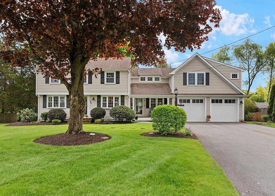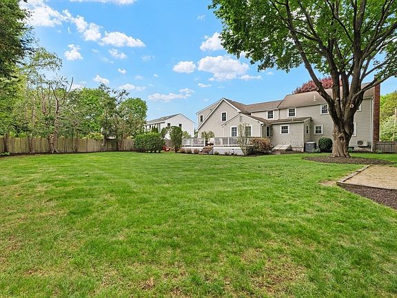 Impeccably maintained, this handsome Colonial offers 4 spacious bedrooms + home office/potential 5th bedroom, all set on a large, level lot. This home impresses inside and out. The spacious family room with vaulted ceiling features sliding glass doors that open to a generous back deck—perfect for entertaining. The well-appointed kitchen showcases rich wood cabinetry, granite countertops and flows into the inviting dining room. The formal living room adds charm and functionality with custom built-ins. Upstairs, the primary suite impresses with 2 walk-in closets and a beautiful en-suite bathroom. 3 additional well-sized bedrooms and a versatile office offer plenty of space. A convenient laundry room and additional full bathroom w/ tub round out the upper level. The finished basement is perfect for a play area, home gym, or lounge while the massive backyard invites all to come and play! The wonderful neighborhood offers easy access to the highway, commuter rail and shopping.