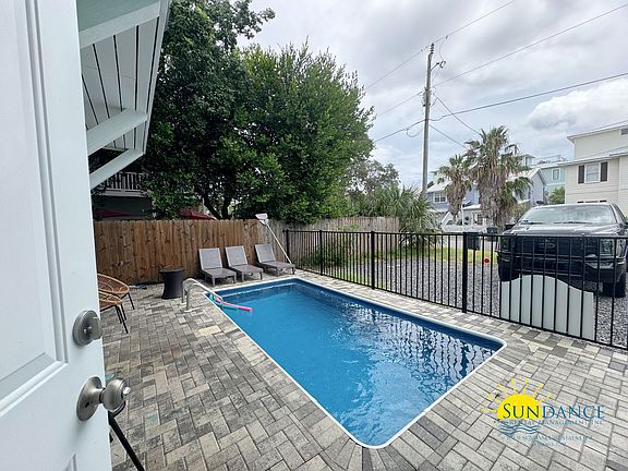 Just one block from the pristine shoreline, this furnished 5-bedroom, 3.5-bathroom home is the perfect coastal getaway. Enjoy the convenience of driveway parking and exclusive gated beach access. 7 to 8 Month Lease Option ONLY. Inside, you'll find a bright, natural light-filled floorplan designed for comfort and style. The spacious eat-in kitchen offers ample countertop and cabinet space, a breakfast bar, and everything you need for easy entertaining. The first-floor mother-in-law suite provides a peaceful retreat, while upstairs you'll discover another primary bedroom with ensuite bath and a private balcony overlooking the pool. Two additional guest bedrooms and a full bathroom complete the second floor. Additional features include a laundry room with washer and dryer, extra storage space, and a convenient half bath. Step outside to your own private paradise, an open patio with a sparkling in-ground pool, perfect for relaxing or entertaining after a day at the beach.