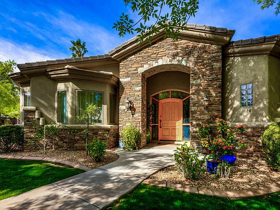 This stunning 5 bedroom, single-level home is located in the gated community of Graystone in Tempe. Upon arriving, you'll immediately notice the curb appeal enhanced by a side-entry garage and stone front. Enter through the large wooden front door surrounded by beautiful glass inlays, and find yourself in the stunning foyer with beautiful polished floors. Rich wood floors guide you through the family room into the spacious kitchen, featuring granite countertops, a stainless steel vent hood, and perfectly sized island with room for barstools. Enjoy breakfast in the eat-in kitchen, surrounded by bay windows for tons of natural light, with a serene setting overlooking the grassy backyard and large covered patio. This popular floorplan offers ample living spaces and storage, in addition to the
