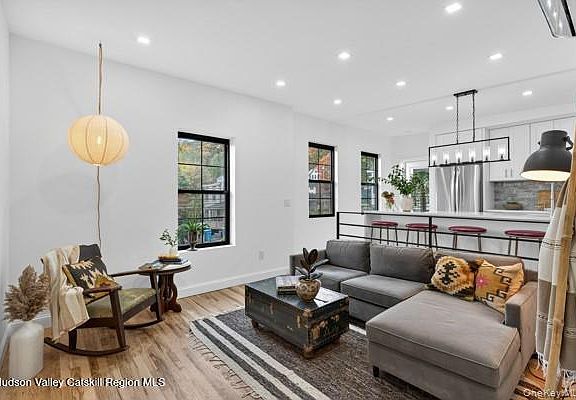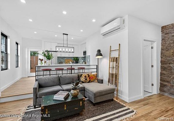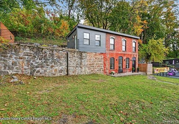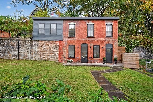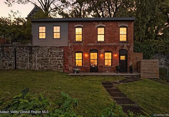 The Marvelous Two-Story Brick Home This timeless beautifully restored two-story brick home perfectly blends modern features with classic historic charm. Spanning approximately 1,100 square feet, the thoughtfully designed layout offers two bedrooms and two full bathrooms, flowing seamlessly throughout the space. Upon entering through the extended mudroom hallway, you'll find a spacious bedroom complemented by a sleek, modern bathroom. As you ascend to the loft area, an original stone accent wall adds character and warmth. At the top of the stairs, the second full bathroom features floor-to-ceiling custom tile work. The cozy living room is perfectly situated between the gorgeous eat-in kitchen and the large upstairs bedroom, creating an inviting and functional living space. Off the gourmet kitchen, an expansive rooftop deck provides stunning views of the homes and streets below—ideal for relaxing or entertaining. Located just steps from the Rondout Creek, this home is within walking distance of restaurants, shops, and the lively Kingston Strand, offering both comfort and convenience in a vibrant setting.