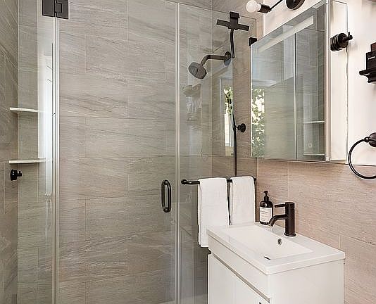 The sleek, contemporary bathroom boasts a full-wall shower, illuminated mirrored medicine cabinet, and refined finishes. Additional highlights include city-quiet windows throughout for peace and tranquility.