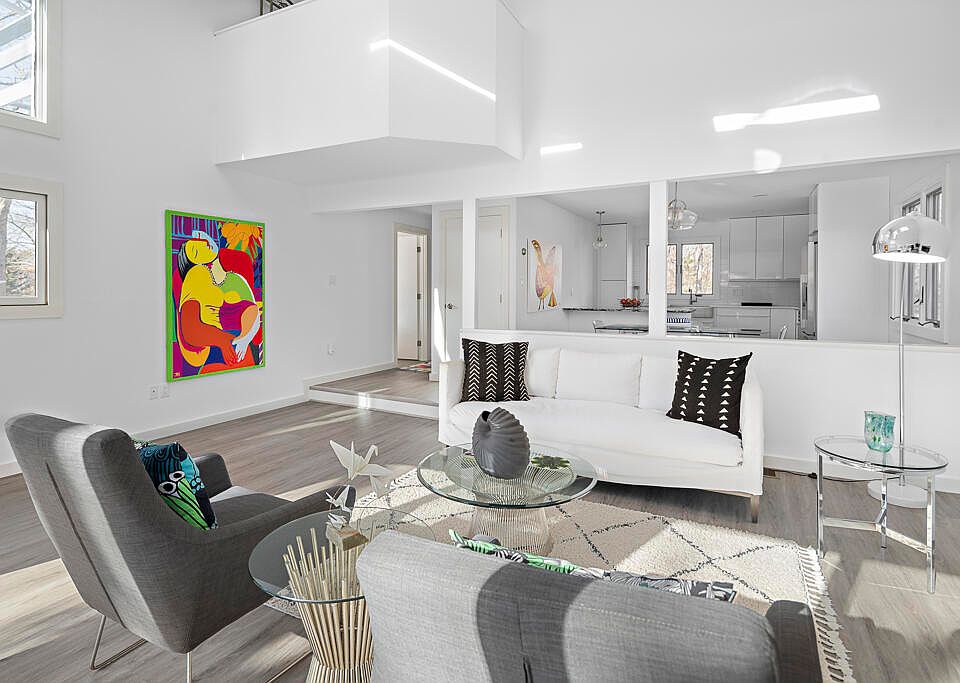 Within a five-minute drive of downtown Oak Bluffs is this cheerful ''tree house.'' Perfect for your year-round, secondary or income-producing home. The lofty living area is awash in south-facing light with skylights and double sliders opening to a sweeping outdoor deck. A convenient first-floor bedroom, currently appointed as a den, has its own sliders to the deck, plus en suite bath. Updates since 2018: a gleaming white-and-stainless kitchen with quartz countertops, modern easy-care flooring, new roof, on-demand hot water system and new furnace. Just add AC condenser! On the second level, two bedrooms, one with private outdoor balcony, share a full bathroom. A ''Juliet'' balcony overlooks the living area. Your 3rd level bonus loft is perfect for spillover living space. Create more living space or workshop In the dry, unfinished basement. Enjoy nearby public access to Lagoon Pond. The home is being sold ''as is.'' Furnishings included.