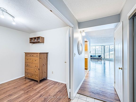 Welcome to Royal Ascot, one of Georgetown's hidden gems! This 1-bedroom plus den suite has been beautifully renovated throughout, featuring newer flooring and appliances, an upgraded bathroom, and fresh paint. At approximately 1,100 sq. ft., this unit is ideal for downsizers, first-time buyers, or investors. The condo offers an open concept living and dining area with a walkout to a private balcony. The kitchen provides generous cupboard and counter space, newer stainless-steel appliances, and a clear view into the living/dining area. The den adds valuable flexibility and can be used as a guest room or home office. The spacious primary bedroom includes a walk-in closet and a second entrance to the bathroom. Enjoy the convenience of in-suite laundry and storage. Royal Ascot is a well-managed and well-maintained building with reasonable fees and excellent amenities, including a party room with kitchen, exercise room, games room, car wash, BBQ area, bike storage, and plenty of visitor parking. One surface-level parking space is included.Located just steps from the scenic Hungry Hollow Trail and within walking distance to parks, restaurants, shops, and more. Don't miss this incredible opportunity to get into the market!