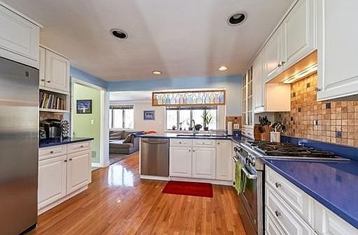 Ideal spa getaway right in the heart of Needham! Imagine coming home to a privately situated house on a cul-de-sac, filled with natural light and tons of flowing and open space. This house has got all that and more. Interior boasts 4 bedrooms, 2.5 baths and two family rooms. An updated kitchen with fun, royal blue countertops keeps it funky, too. Well-cared for house includes gas heat with forced hot air and cooling system less than 10 years old. Young architectural roof and back deck. House flows into a private backyard with a sweet swimming pool that is 9.5 feet deep and impeccably cared for. Oversized 2 car garage with tons of storage space. Yard is surrounded by mature bamboo ensuring privacy for family fun in the hot tub and pool! Close to 95, route 9 and all that Needham has to offer!