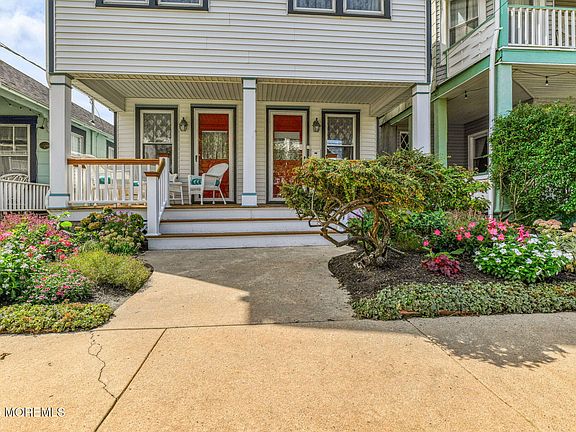 LOCATION: 2nd Beach Block! A former duplex converted into a charming, spacious single family Ocean Grove Home, you're immediately greeted with beautiful, lush gardens, and a spacious mahogany porch. Enter this bright home to a living room/dining area,1st floor office/bedroom w/ French door, large kitchen w/breakfast nook, full bath, laundry and pantry. The 2nd floor has 4 Bedrooms and a sitting room with fabulous Ocean views, a remodeled full bath, half bath and office! One bedroom can easily be turned into a primary ensuite & sunroom. Hardwood floors throughout! Exterior maintenance free vinyl siding, small rear yard w/grill, an exterior closet for beach equipment and a small shed. Conveniently located to the beach, boardwalk, town and shopping. Call for an appointment today!