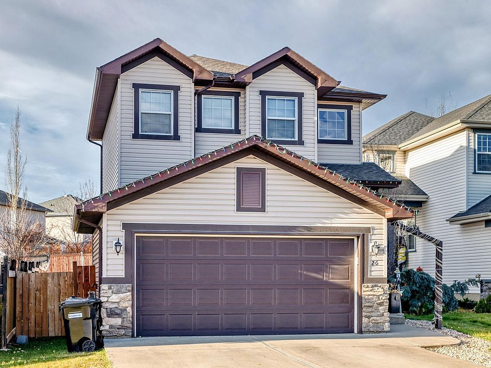 Best Location backing Green Space, Beautiful Condition !!! This perfect 2-storey is in move in condition and boasts double attached garage, newer fully developed bsmt, 3 and a half washrooms, located in very desirable Harvest Ridge. This property features a bright and open floor plan with plenty of natural light from a west back yard. The main floor has 9 foot high ceilings, hardwood floors, upgraded california knockdown ceilings, a cozy gas fireplace perfect for relaxing or entertaining in style and modern elegance. The kitchen provides good cabinet and counter space, flowing seamlessly into the dining area w easy access to large deck, large backyard. Upstairs you’ll find three bedrooms, including a primary suite w walk-in closet and ensuite. The fully finished basement adds more living space with a large recreation room. More upgrades newer HWT, 30 year shingles ! Located close to schools, parks, trails, all amenities, this home is perfect for anyone seeking comfort & convenience in a great community.