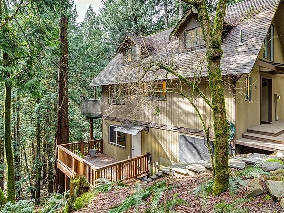 This rustic-chic home in the trees features 2 bedrooms & 2 baths surrounded by three decks. The home underwent a major renovation in 2013 that included structural and cosmetic upgrades. Designer custom touches include a reclaimed fireplace mantel, claw foot tub in master bed, and one-of-a-kind light fixtures. The extra large lot is private on three sides with evergreens pruned for maximum light. The Sudden Valley area offers many amenities including golf, beach access, & boat launch.