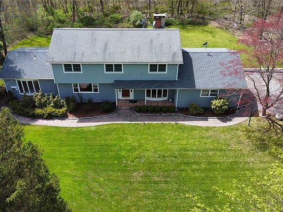 This expansive colonial, with over 4500 sq. ft.of useable space including a 2-story in-law suite, is the home for you if space is what you need. The main level offers a nice floor plan with a large living room flowing into the dining room where you can access the huge, 384 sq ft sunroom. The kitchen with new quartz counters is spacious and leads into the bright family room with new hardwood floors and a wood stove. Upstairs the 27-ft primary bedroom has the space to create a private sanctuary, complete with loads of closet space and a brand new bathroom with a quartz counter sink, tile floor and gorgeous rain shower head. Three additional guest bedrooms and a full bath complete the upper level. Freshly painted interior, new roof over apartment and garage and new electric panel. This home is primed for multi-generational living with a legal in-law apartment that can double as a fabulous home office with its own entrance or can be accessed from the main house. It offers a bedroom with walk-in closet, full bath with tub, great room with kitchenette and two heated rooms on the lower level. The home is full of updates including a completely remodeled primary bathroom, new oil tank, new roof over in-law suite and garage, new electric panel, newly painted interior walls and trim in 2022, freshly painted exterior, newer water tank, custom walkway and patio, newer paved and expanded driveway and new recessed lights. The finished basement, boasts a half bath, plenty of storage space, and walk-out access to the yard, where a third garage is accessible for additional storage. The 800 sq. ft lower level, not included in the square footage, is perfect for a gym, game room, or a movie room. With almost 2 acres of property, enjoy the privacy of the treed lot and the cleared grass area. The location is great for local activities and commuting. Being sold As-Is. Price reflects updates needed.