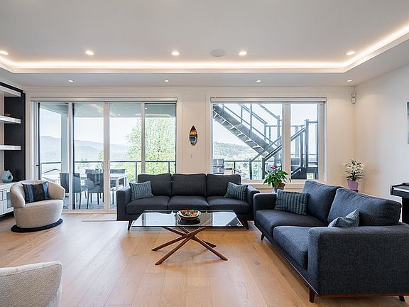 Exceptional 6 bed, 6 full bath home offers breathtaking views of Mt Baker & Burrard Inlet from 3 levels. Chef’s kitchen boasts premium Bosch appliances, double wall oven, oversized island & ample cabinetry. Enjoy seamless indoor/outdoor living w/a covered deck(gas BBQ/heater hookups) & rooftop patio w/gas fire pit hookup & sweeping water & mountain VIEWS! The luxurious primary suite feat a spa-inspired ensuite w/dual vanity, oversized rain shower & deep soaker tub. Smart home feat inc Control4 automation, A/C, radiant heating, smart thermostats, video security, and b/i central vac. The lower level incl a spacious family rm, flex space w/separate entrance, and a newer legal 2 bed suite complete w/kitch & laundry,ideal for rental or extended family. Bonus EV level 2 charging! Shows like NEW!