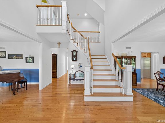 Perched gracefully on a gentle hilltop in the peaceful Goshen countryside, this custom-built Colonial offers commanding panoramic views and an unmatched sense of privacy. From the moment you step onto the solid cement front porch—crafted for both strength and relaxation—you’ll be captivated by the beauty of nature and the serenity of country living .Constructed with uncompromising quality, this home features a steel I-beam, 2x12 flooring, Douglas fir lumber, and timeless details throughout. Inside, gleaming ash hardwood floors flow through an expansive floor plan designed for both comfort and elegance. The chef’s kitchen is a true showpiece, boasting a Wolf commercial-grade range, granite countertops, a generous center island, pantry, and a sun-filled breakfast area that takes in your wooded backyard views. Gather in the grand family room with its striking stone fireplace, retreat to the oversized primary suite with its spa-like marble bath and walk-in closet, or step out onto the paver-stone patio for evening sunsets. Additional highlights include 9-foot ceilings on both levels, a walk-up attic, additional attic over the garage, Lennox Gas Forced Air furnace (4 years young), AC (4 years young), Hot Water Heater (2021), Andersen windows, New porch railings (2025), Culligan water softener system, 4-car garage, plus a finished full basement perfect for entertaining over guests. Over 5000 SQFT as basement is 1620 SQFT finished space. A home where every detail was built to last—and every view reminds you why you’re here. Seller offering a 1 Year Home Warranty to buyer.