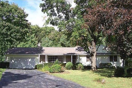 CUL DE SAC!! THIS VINYL RANCH IS CENTRALLY SITUATED ON PRIVATE, WOODED .57 ACRE LOT NEAR SCHOOLS AND SHOPS. MARBLE ENTRY. LIVING ROOM WITH GAS FP IN STONE SETTING and BOW WINDOW OPENS TO DR. KITCHEN HAS BIRCH CABINETS AND NEWER APPLIANCES. SLIDERS TO FAMILY ROOM WITH BUILT-INS. FROM KITCHEN AND FROM DINING ROOM. MBR HAS WALK-IN-CLOSET. REC.ROOM. MANY WOOD FLOORS. HEAT AND C.AIR APPROX. 4 YRS. ROOF REDONE WITHIN 5 YEARS.
