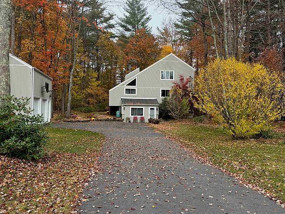 Bright and spacious updated contemporary saltbox on a family friendly cul-de-sac. Large quartz countertops and stainless steel appliances in kitchen, open to living room with vaulted ceiling, skylights, and fireplace with sliders to deck. One bedroom on main floor and two bedrooms upstairs. Two bedrooms with sliders to balconies. Detached garage with large finished, heated room above for storage or workspace. Large finished room in basement with propane stove and large laundry/utility room. Recent updates including kitchen, custom windows, driveway, roof, garage floor, well tank and sediment filter. Country setting but close to shopping and entertainment. Hampstead has a town beach, town forest with trails, and desirable school system. Easy access to routes 93 and 495 for travel to Boston, ocean, lakes, and mountains. Don’t miss this one! Showings begin Sunday 11/10/2024 at 10:00 am