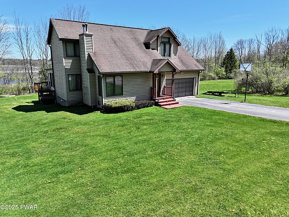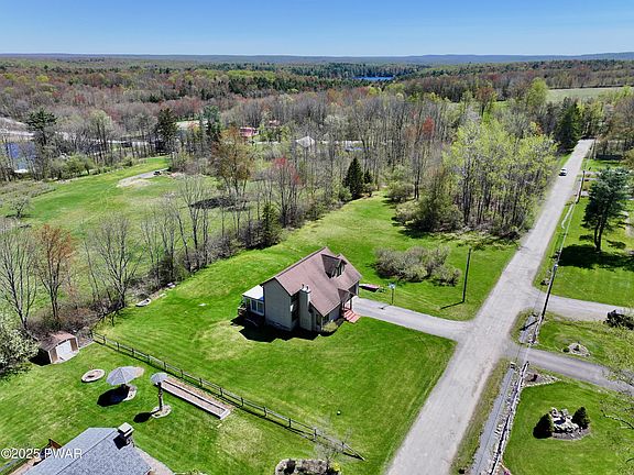 SUNSHINE BRIGHT CUSTOM CONTEMPORARY ON 1.62 ACRES, NO COMMUNITY - ORIGINAL OWNER. Discover comfort, privacy, and natural beauty in this thoughtfully designed contemporary home with well-maintained property features a functional layout floor plan, hardwood floors throughout, a spacious basement offering ample storage or potential additional living space, 2-3 Bedrooms, 2.5 Bathrooms, Updated kitchen with quartz countertops and ceramic tile back splash and floor, Owner's suite includes ductless A/C, new walk-in shower, and Corian vanity, Ceiling Fans and accent lighting, Living room with propane field stone fireplace, Oak staircase in entryway, Oil hot water baseboard heating, Attached 2-car garage. Room to Play! The Open level grassy yard is great for gardening, outdoor recreation, entertaining or practicing your sports like golf chipping, putting or soccer and the Blueberry bushes and light woods provide natural charm. The fenced area off the sun room is ideal for pets or a play area. Plus the Sun room offers views and the side deck currently used for grilling was formerly connected to an above-ground pool . Located minutes from Lake Wallenpaupack for boating and water recreation, close to Pocono attractions, and ideal for commuters--this property offers a prime central location with peaceful country living.Don't miss your opportunity to own this bright, spacious, and versatile home--perfect as a full-time residence or weekend getaway. Schedule your private showing today!
