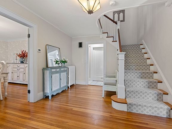 This Spanish-style Colonial home with fantastic curb appeal is on a tree-lined street in desirable Waban. Through the foyer is an elegant dining room with beautiful wall coverings and board and batten woodwork and a lovely home office. Across the foyer there is a gracious living room with a wood burning fireplace, which leads to a light-drenched sunroom and into a large family room with built-in cabinetry. The eat-in kitchen, a bedroom and powder room complete this floor. On the second level you'll find the primary bedroom with ensuite bath, sitting room, stunning walk-in closet with island and vanity, two additional bedrooms and an office. The finished lower-level has a flexible, spacious bonus room great for a game/tv/play room or workout space. The large landscaped, fenced yard is perfect for gathering family and friends. Updates include Pella windows & new HVAC. Close to Waban center, Starbucks, shops, restaurants, schools, the neighborhood club/pool, the Green Line and highways.