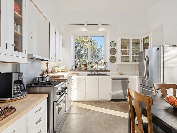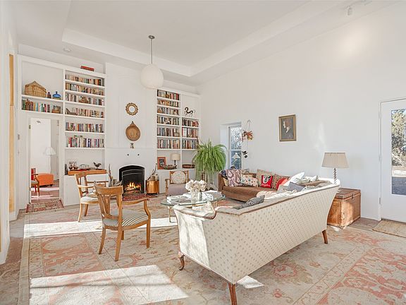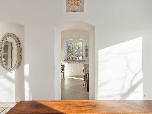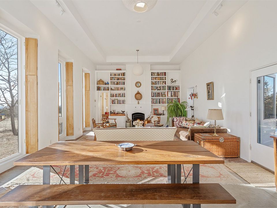 Elegant European-style farmhouse on 5 acres in Arroyo Hondo. This eco-friendly, passive solar residence is built from pumice-crete with flawless proportions and an abundance of light streaming in from the floor to ceiling windows. The country kitchen and gracious living room with Rumford fireplace create a generous separation of space between the two en suite bedrooms. Twelve-to-thirteen-foot ceilings, concrete floors with radiant heat throughout, lime-washed exterior walls, and a classic pitched metal roof make for an understated refined aesthetic. This tranquil property is well sited on a meadow with views of the Sandias, Ortiz, and Sangre de Cristo mountain ranges.