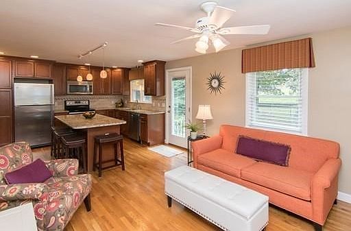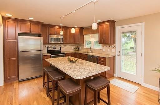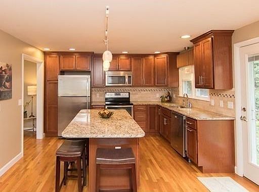 - Kit Dscrp: Flooring - Hardwood, Countertops - Stone/Granite/Solid, Cabinets - Upgraded, Kitchen Island, Stainless Steel Appliances, Recessed Lighting, Remodeled, Exterior Access